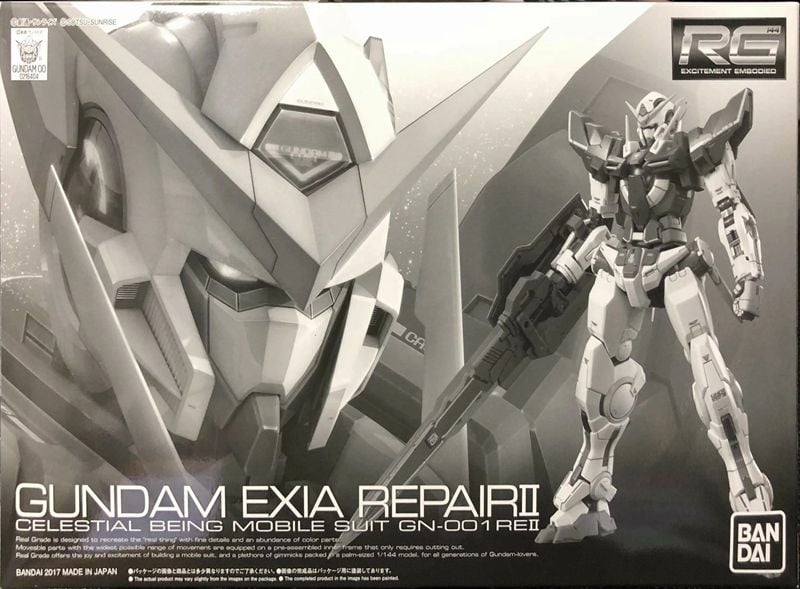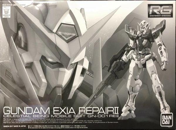 RG 1/144 GN-001REII Gundam Exia Repair II là biến thể nâng cấp của Exia xuất hiện ở cuối mùa 2 Mobile Suit Gundam 00, phát hành dạng độc quyền Hobby Online Shop (P-Bandai) vào 03/2017. Bản RG tái hiện đúng cấu hình Repair II: loại bỏ các cáp lộ thiên ở tay/chân, tinh chỉnh cụm vai, cánh tay trên, hông và đùi, di chuyển vị trí treo saber về giáp lưng sau; tổng thể gọn gàng và “sạch” hơn so với Exia thường.