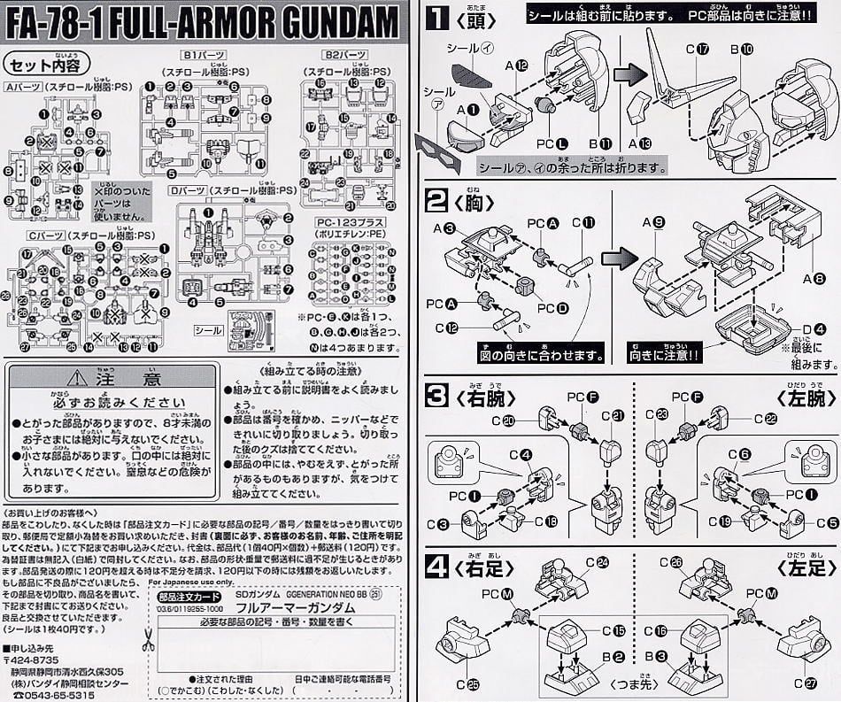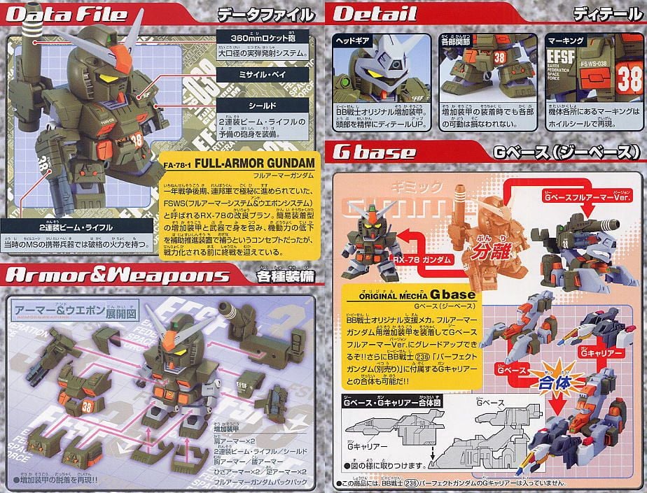 BB251 FA-78-1 Full-Armor Gundam là một trong những mẫu Mobile Suit nổi bật trong dòng sản phẩm 'G-Generation Neo' của SD Gundam. Mô hình này có thể được lắp ráp thành ba biến thể khác nhau: RX-78 Gundam đơn giản (không có ba lô và giáp phụ), 'G-Base' - một cỗ máy được thiết kế khác, hoặc Full-Armor Gundam. Tuy nhiên, với một bộ kit, bạn chỉ có thể lắp ráp được một trong ba biến thể này. Mô hình có các chi tiết được đúc sẵn với độ chi tiết cao và màu sắc sống động. Các sticker đi kèm giúp tăng thêm độ chân thực cho mô hình. Đặc biệt, sản phẩm này không cần keo hoặc sơn để lắp ráp, giúp bạn dễ dàng hoàn thiện mô hình.