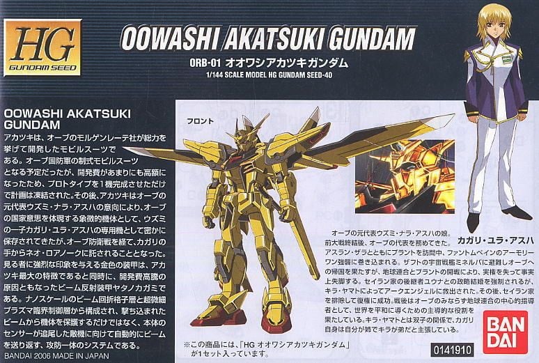 Phiên bản HG SEED 1/144 Oowashi Akatsuki Gundam tái hiện lại thiết kế mạnh mẽ và đầy tinh xảo của Akatsuki Gundam, với đặc điểm nổi bật là bộ giáp màu vàng đặc trưng chủ đạo kết hợp với các chi tiết đỏ, trắng, xanh, đen, xám mang lại sự nổi bật trong bộ sưu tập Gunpla của bạn.