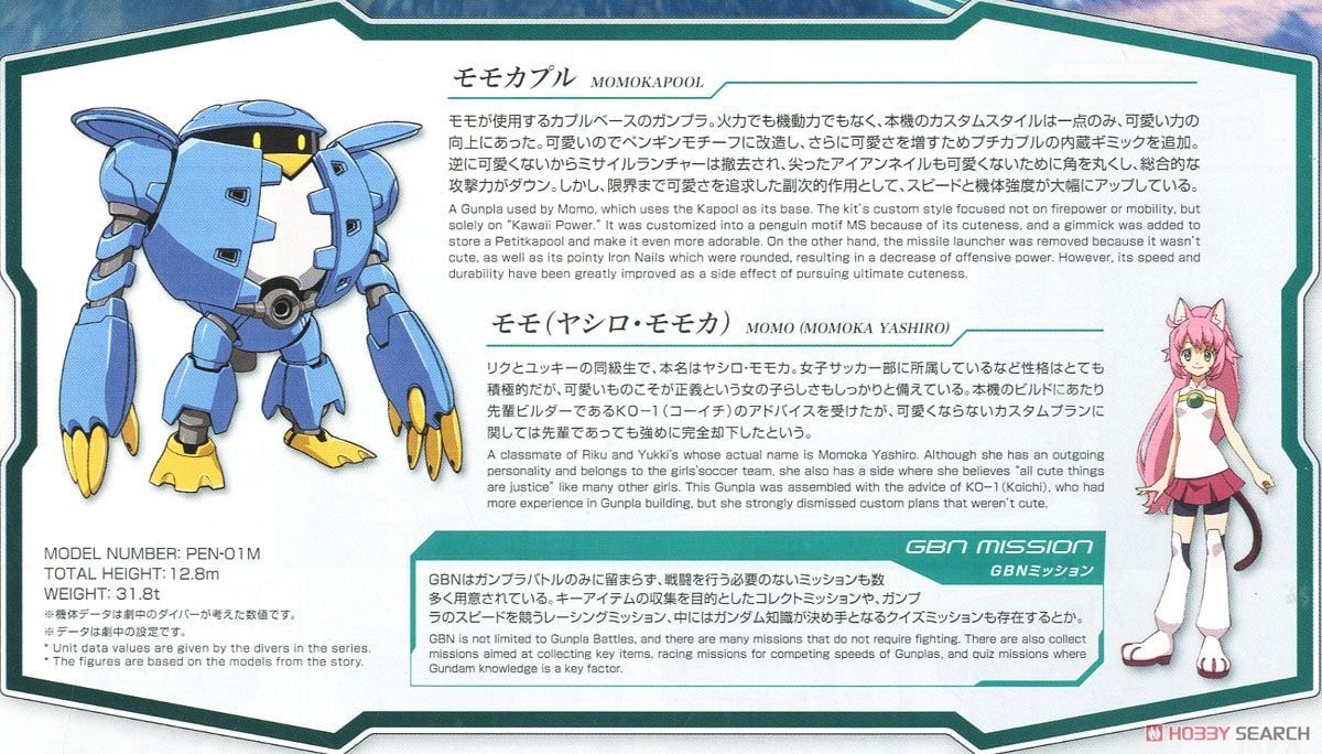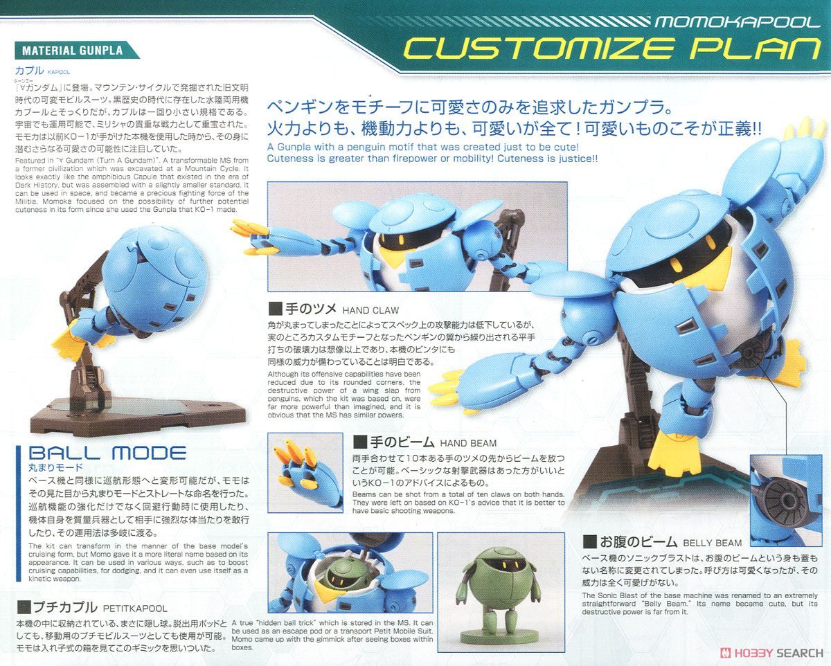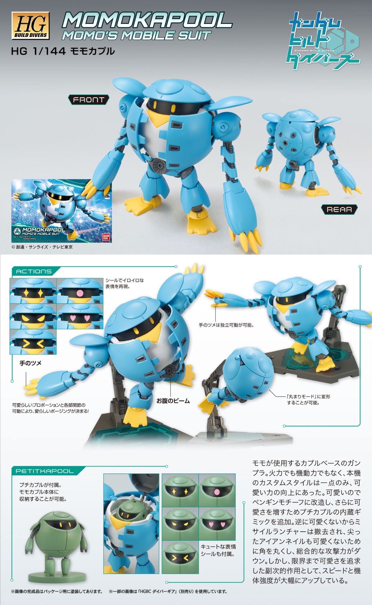 Được thiết kế dựa trên cỗ máy Kapool, Momokapool có hình dáng mà màu sắc của một chú chim cánh cụt cực dễ thương được chế tạo và lái bởi Momo, nữ chính của series Gundam Build Divers.