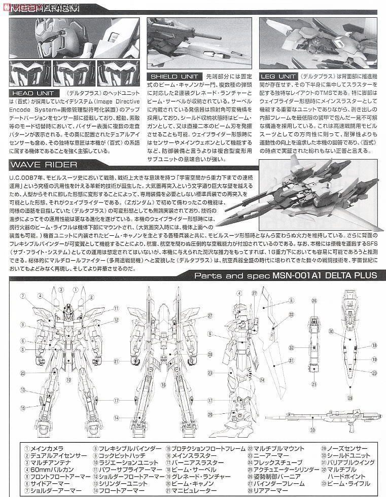 Sở hữu thiết kế thanh lịch với tông màu xám bạc sang trọng, Delta Plus nổi bật với khả năng biến hình giữa hai chế độ Mobile Suit và Wave Rider.