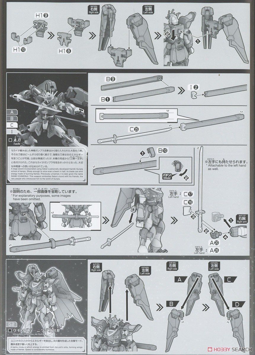 Bộ mô hình được đính kèm nhiều loại hiệu ứng lửa đa dạng khác nhau, kiếm Katana kèm theo bao kiếm và một áo choàng được thiết kế dựa trên cỗ máy Master Gundam.