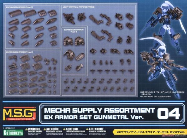 Bộ sản phẩm đổi màu đúc cho các mẫu Ex Armor A / B / C theo tông Gun Metal (giống màu khung HexaGear Gunmetal). Mỗi phiên bản có các lỗ/trục kết nối 3mm, tương thích rộng rãi với các series như Frame Arms, Frame Arms Girl, Hexa Gear, Megami Device… giúp bạn tùy biến dễ dàng.